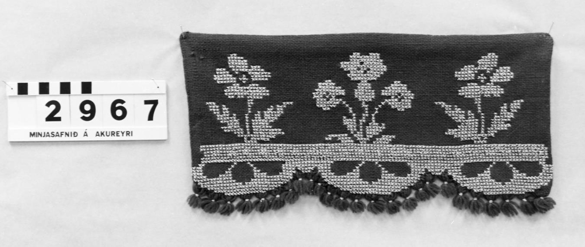 Í hann er saumuð blóm með gulu og að neðan eru kögurdúskar og lauf.