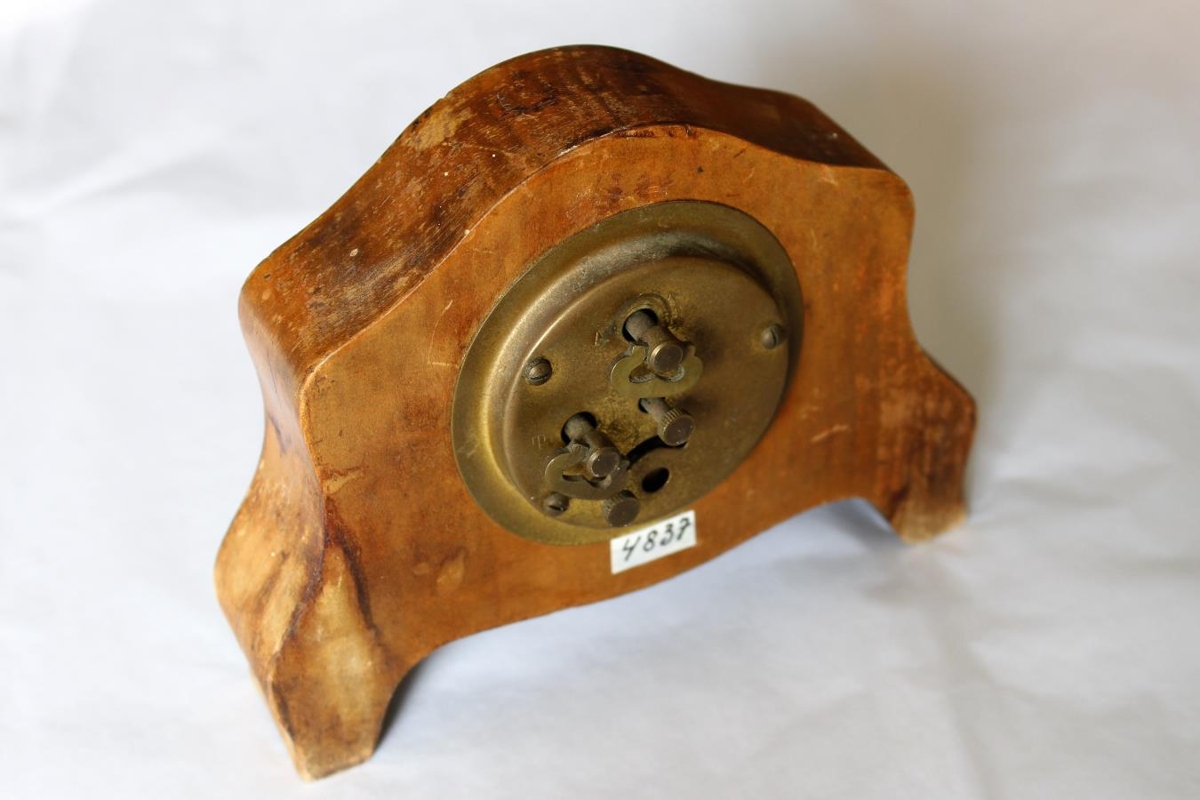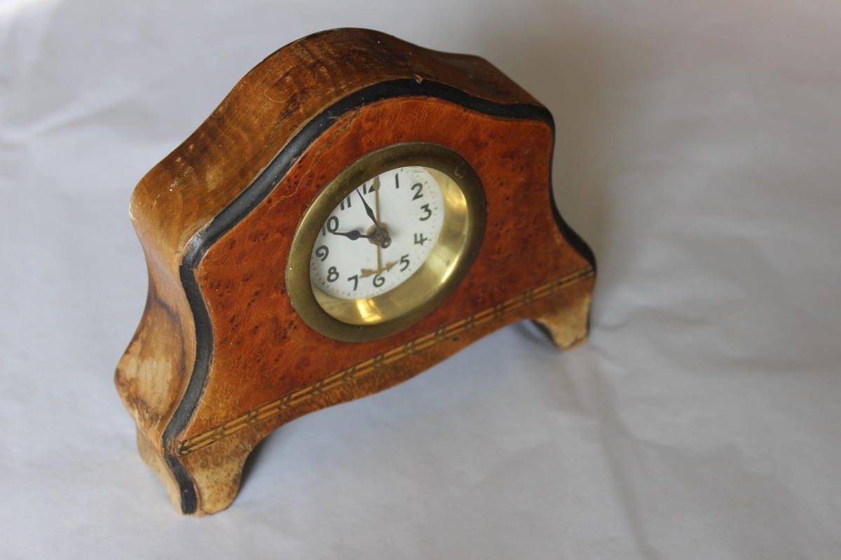 Lítil borðklukka. Var áður í eigu Guðlaugs E. Einarssonar frá Arnkötlustöðum á Reykjavíkurvegi 27, Hafnarfirði.
