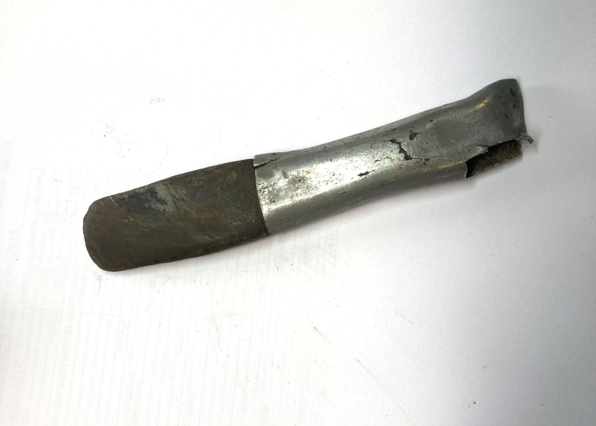 Ljábrýni, slitið. Fest upp á álhólk. Lengd 16,5 cm. Úr dánarbúi Gísla Stefánssonar bónda í Ystakoti í V-Landeyjum.