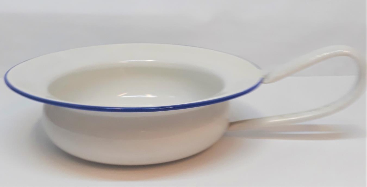 Emelerað, hvítt með bláum kanti. Þvermál 25 sm og hæð 7 sm.