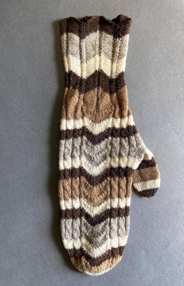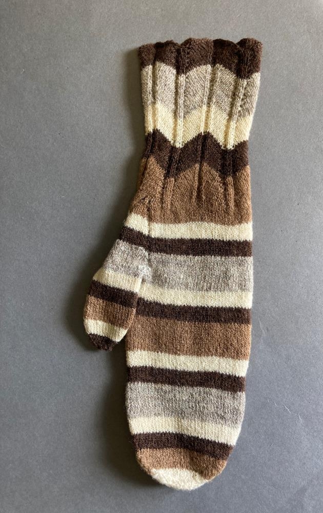 Útprjónaðir kvenvettlingar í sauðarlitum, prjónaðir af móður gefanda, Ingibjörgu Daðadóttur, um 1930. Ingibjörg var og móðir Maríu á Barkarstöðum í Fljótshlíð.