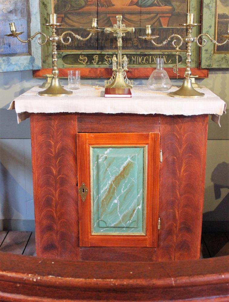 Altari Sigluvíkurkirkju, illu heilli nýmálað og að öðru stórskemmt. Frá Þórunni Jónsdóttur ljósmóður í Ey og syni hennar Ólafi Jónssyni á Eylandi.