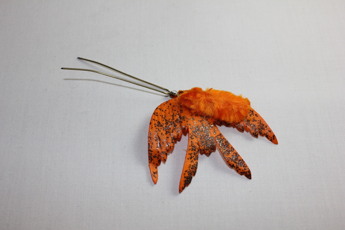3 danskort (ÁBS 1056 - 58) með viðfestum hárnælum. Fiðrildi, 2 úr málmi, eitt úr vaxbornum pappa.