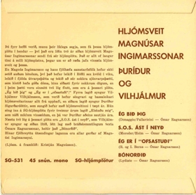 Þetta er 45 snúninga (r.p.m) plata með 4 lögum. Útgefandi SG-hljómplötur og eru útsetningar gerði Magnús Sigurjón Ingimarsson (1933-2000)