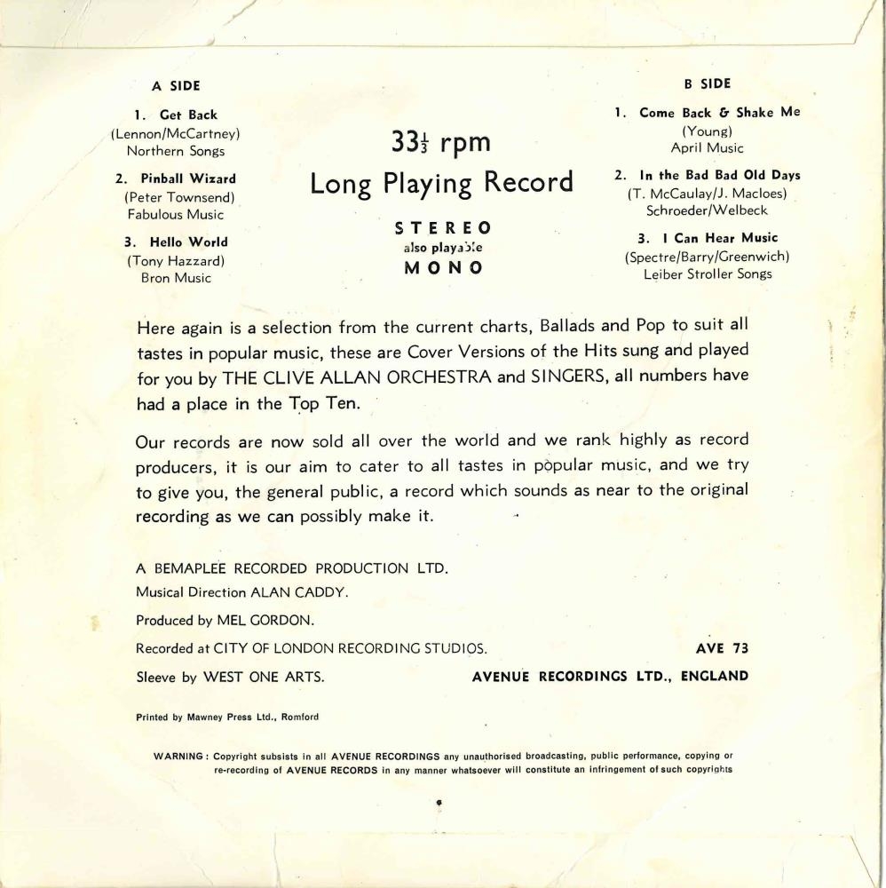 "The Clive Allan Orchestra" ábreiðu-útgáfa vinsælla laga frá árinu 1969. Er þetta 6 laga plata, hljóðrituð í stereo en einnig er hægt að spila í mono. Hljóðritað í City of London Recording Studios.