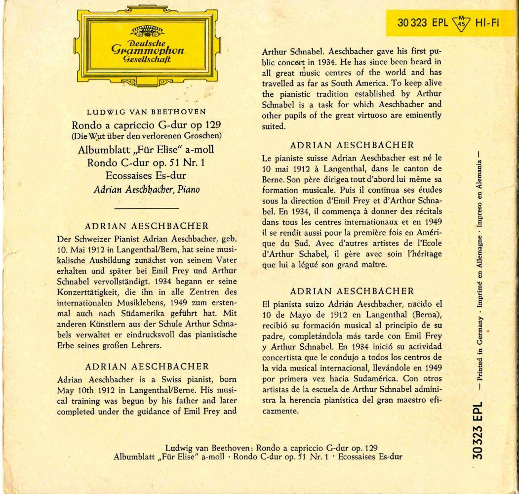 Klassíski píanistinn Adrian Aeschbacher (1912-2002) spilar verk eftir Ludwig van Beethoven og var þekktur fyrir sínar túlkanir á verkum Beethoven. Þetta er plata 45 snúninga (r.p.m) með 4 tónverkum og tekin upp í mono.
