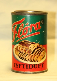 Dósin er með loki og álímdum miða. Áletrun: Flóra - Sælgætis og efnagerð - Akureyri - Lyftiduft.