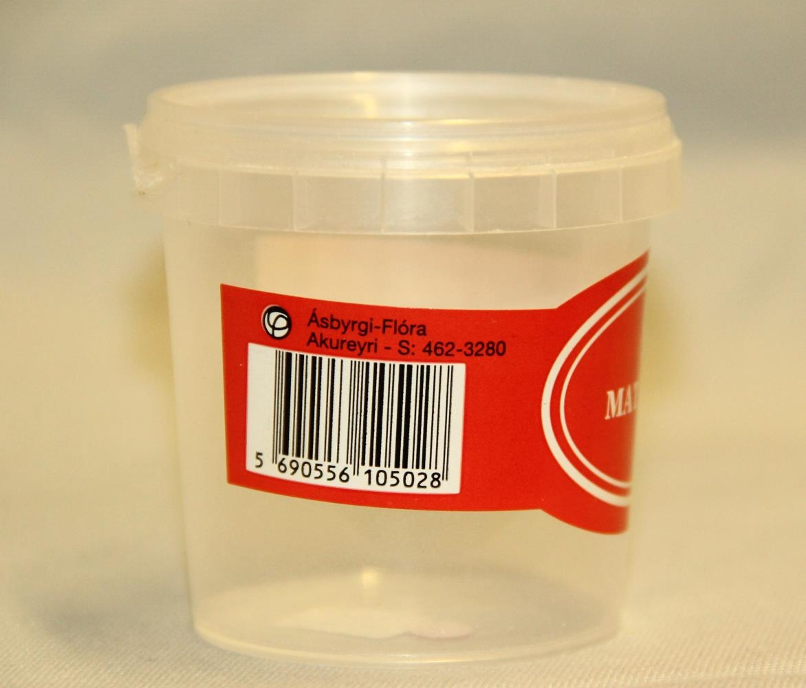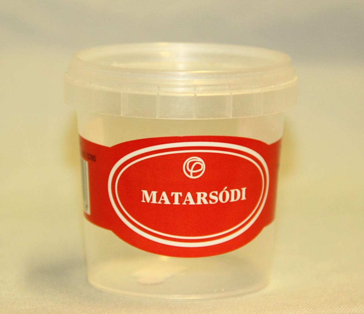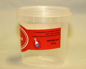 Dósin er glær með álímdum miða, rauðum í grunninn með hvítu letri. Áletrun: Matarsódi. StærðÞ 175 gr.