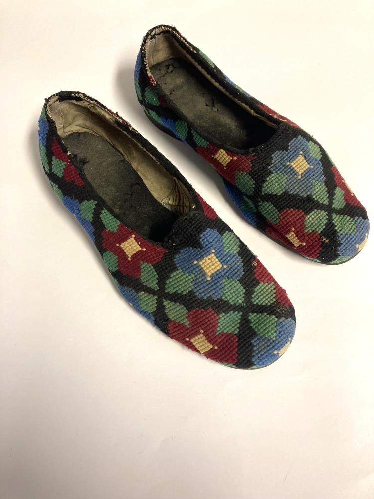 Inniskór Skúla Jónssonar trésmiðs í Reykjavík, krosssaumaðir af konu hans, Ólafíu Helgadóttur.