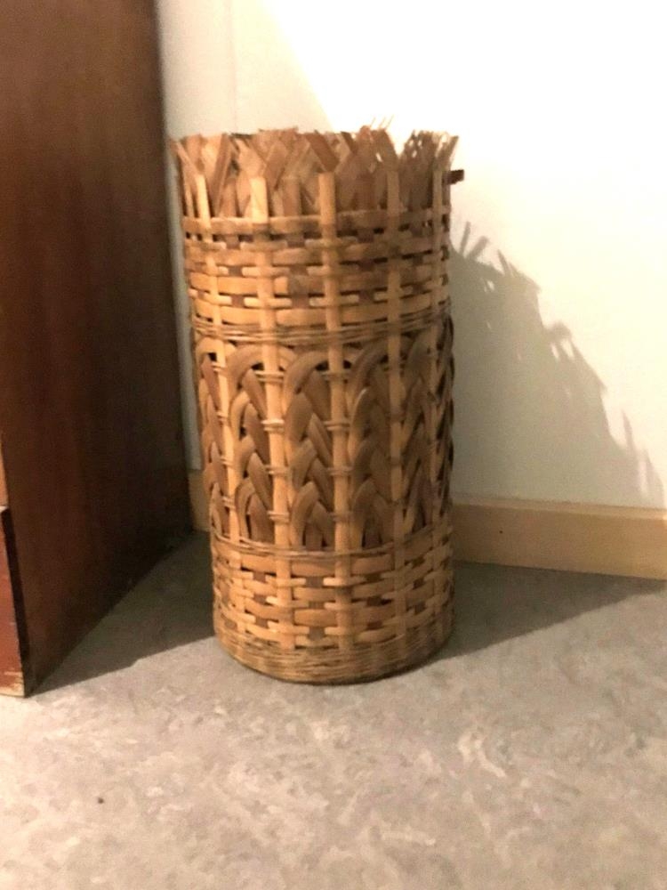 Kringlótt, upphá tágakarfa. Hæð 36 cm, þvermál 19 cm. Ætluð fyrir göngustafi heimamanna og gesta í anddyri. Dönsk. Afhent af Þórði Tómassyni en honum gaf Ellen Sighvatsson í Reykjavík.