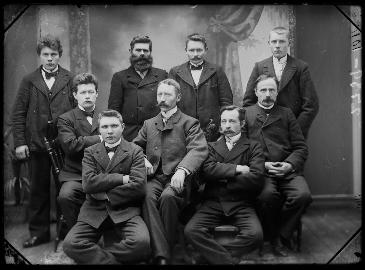 Níu karlmenn á ólíkum aldri. Aðeis einn þekkist Sigurður Sigurðsson frá Langhólti búfræðingur sem situr lengst th.