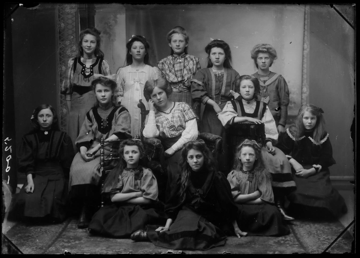 Hópmynd af konu og tólf stelpum. Líklega kennari með nemendur.