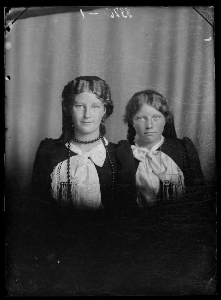 Tvær ungar konur. Lílkega systur. Brjóstmynd. Stúlkan t.h. er líklegast Ingveldur Brandsdóttir, systir Ktistínar.
