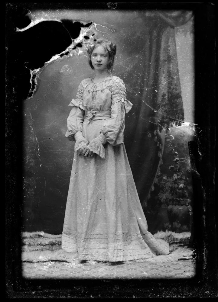 Kona í kjól með pífum á ermum og margs konar skreyti.