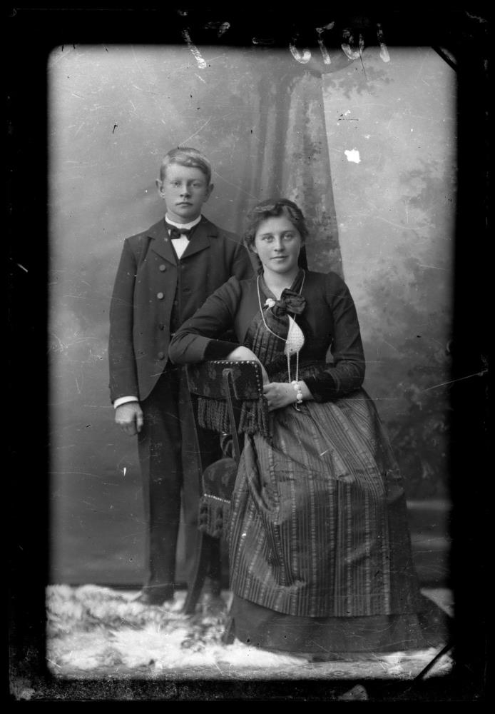 Kona og drengur. Sitjandi er Ragna Gunnarsdóttir frá Reykjavík, síðar læknisfrú á Hvammstanga. Með henni er líklegast einn af bræðrum hennar.