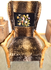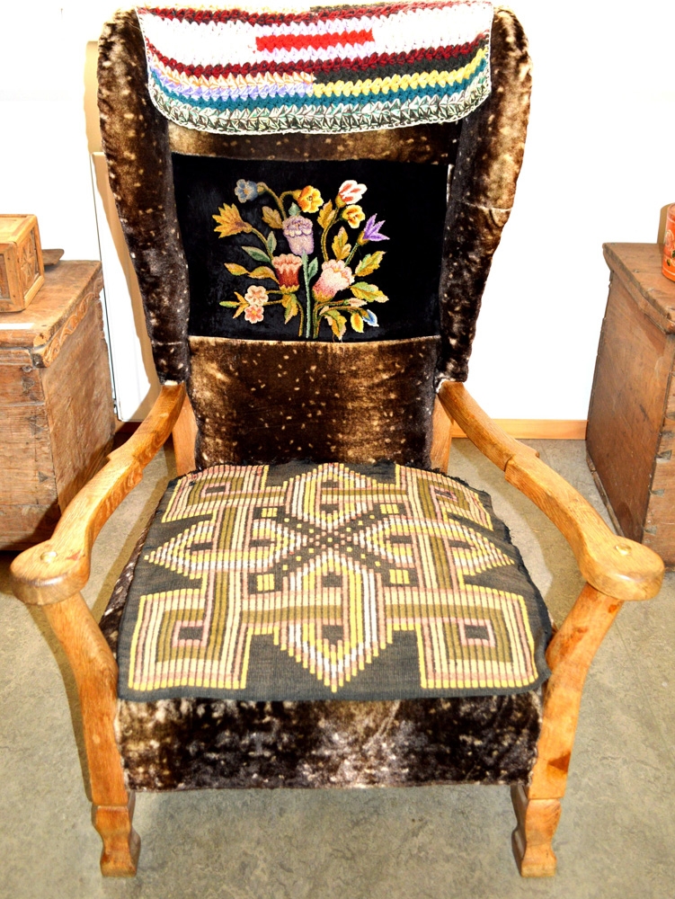 Stór hægindastóll með örmum, klæddur skinnlíki, úr eigu Árnýjar Filippusdóttur skólastjóra og smíðaður fyrir