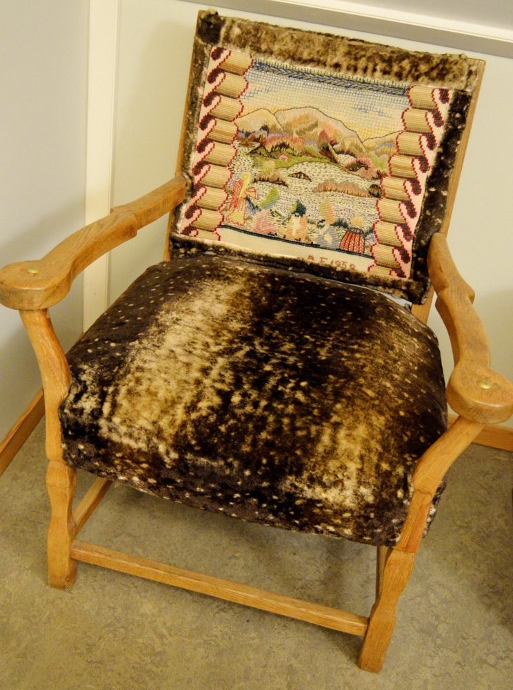 Hægindastóll úr eigu Árnýjar Filippusdóttur og með útsaumi hennar í baki.