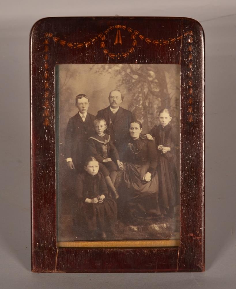 Innrömmuð svar/hvít ljósmynd af hjónum með fjögur börn í brúnun viðarramma með áteiknuðu skrauti