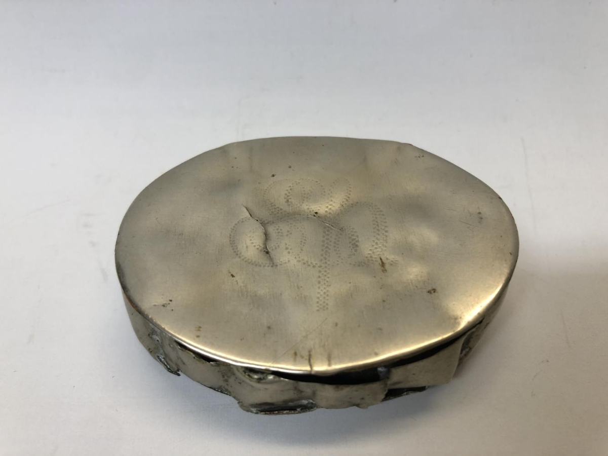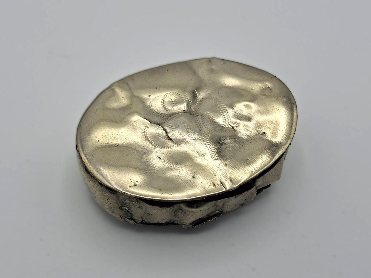 Silfurtóbaksdós, áletrun á loki sem erfitt er að lesa úr. Gætu verið þrír bókstafir. Dósin er beygluð og augljóslega mikið brúkuð. Guðmundar Snorrasonar (1843-1922) átti dósina. Hann var sjóróðramaður og daglaunamaður á Eyrarbakka. Bjó í Bráðræði og var afi Ingibjargar Oddsdóttur í Bráðræði.