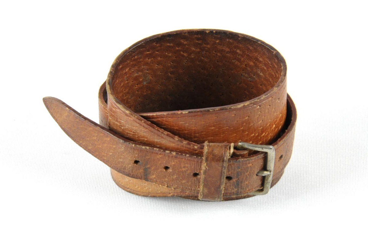 Úlnliðshlíf, úlnliðsól. Rauðbrún leðuról sem sett var á úlnliðinn til þess að styrkja hann og vinna gegn sinaskeiðabólgu.