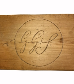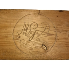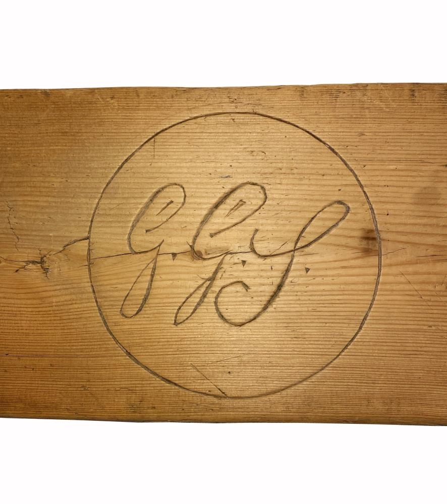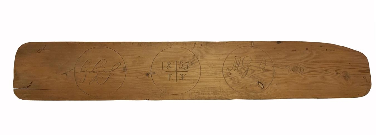 Rúmfjöl úr eigu hjónanna Maríu Guðmundsdóttur og Guðmundar Gíslasonar á Bollastöðum. Í rúmfjölina er búið að skera út skammstafanir þeirra, GGJ (vinstra megin) og MGD (hægra megin), í miðjunni er ártalið 1857.