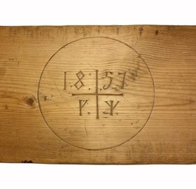 Rúmfjöl úr eigu hjónanna Maríu Guðmundsdóttur og Guðmundar Gíslasonar á Bollastöðum. Í rúmfjölina er búið að skera út skammstafanir þeirra, GGJ (vinstra megin) og MGD (hægra megin), í miðjunni er ártalið 1857.