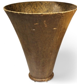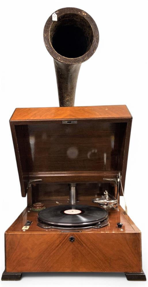 Grammafónn í viðarkassa með stórum, tvískiptum lúðri. Lúðurinn gerður úr hertum pappa, þvermál lúðurs 76 cm.
