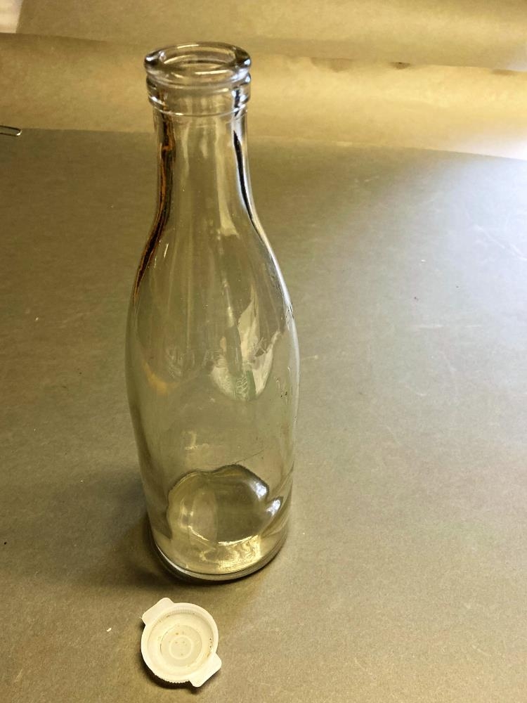 Mjólkurflaska með plastloki. Glært gler og upphleyptir stafir Mælk-Fløde 1/1 l. Voru notaðar á fyrrihluta 20. aldar