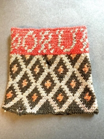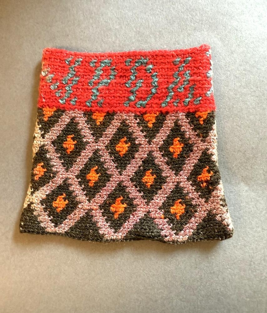 Handstúka ( smokkur ) úr eigu Þórunnar Pálsdóttur í Gerðum, vafalaust verk hennar, prjónuð úr mislitu bandi, með tíglaskreytingu og ísaumuð: ÞORUNPDA = Þórunn Pálsdóttir á. Stærð 11 * 11 cm. Stúkan sem á á móti þessari, er í eigu Bergþóru Guðnadóttur frá Krossi.