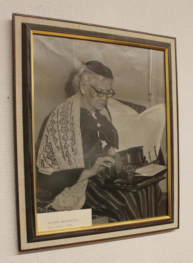 Ljósmynd af Halldóru Bjarnadóttur - situr á rúmmi sínu með ritvél á hnjánum. Íklædd peysufötum og með dúksvuntu. Myndin er tekin 100., jólin árið 1972 af Sigursteini Guðmundssyni, lækni.