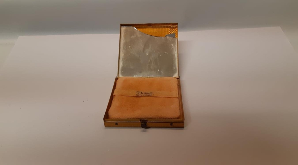 Púðurdós. Brotinn spegill á loki, á púðanum stendur "Dosset fifth avenue".