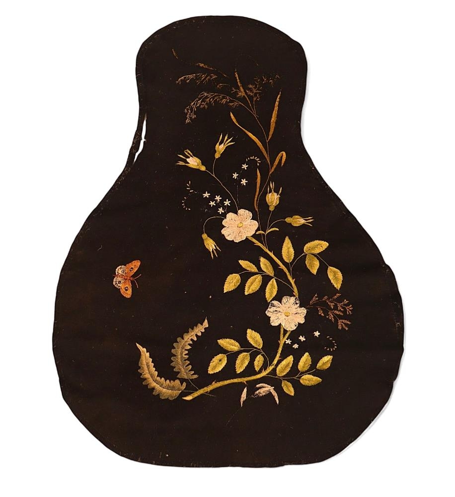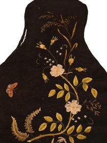 Ófrágengin söðulsessa, útsaumuð. Svartur grunnur, ullarefni, ísaumað með mjög fínu útsaumsgarni.