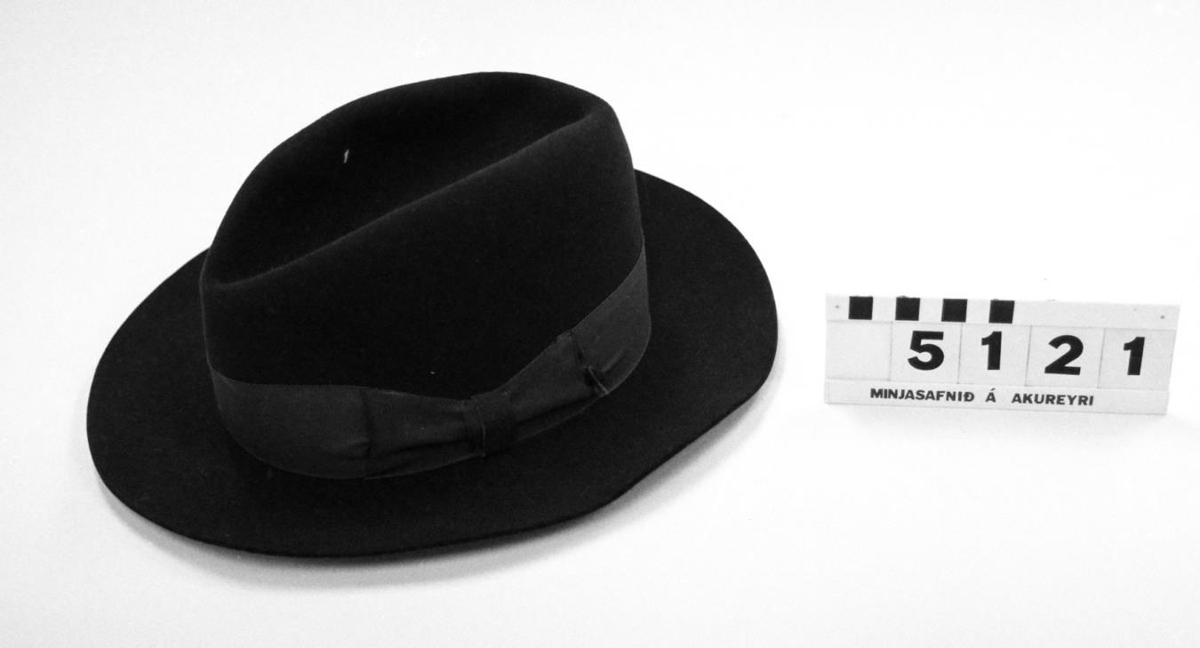 Karlmannshattur, svartur með grænu fóðri og svitaskinni. Dálítið notaður.