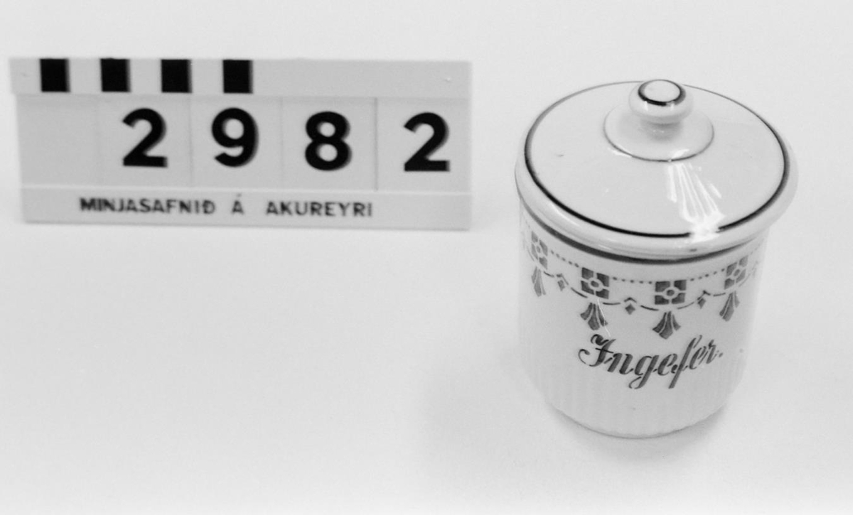 loki. Hvít með bláu skrauti og röndum , merkt "Ingefer". Þvermál