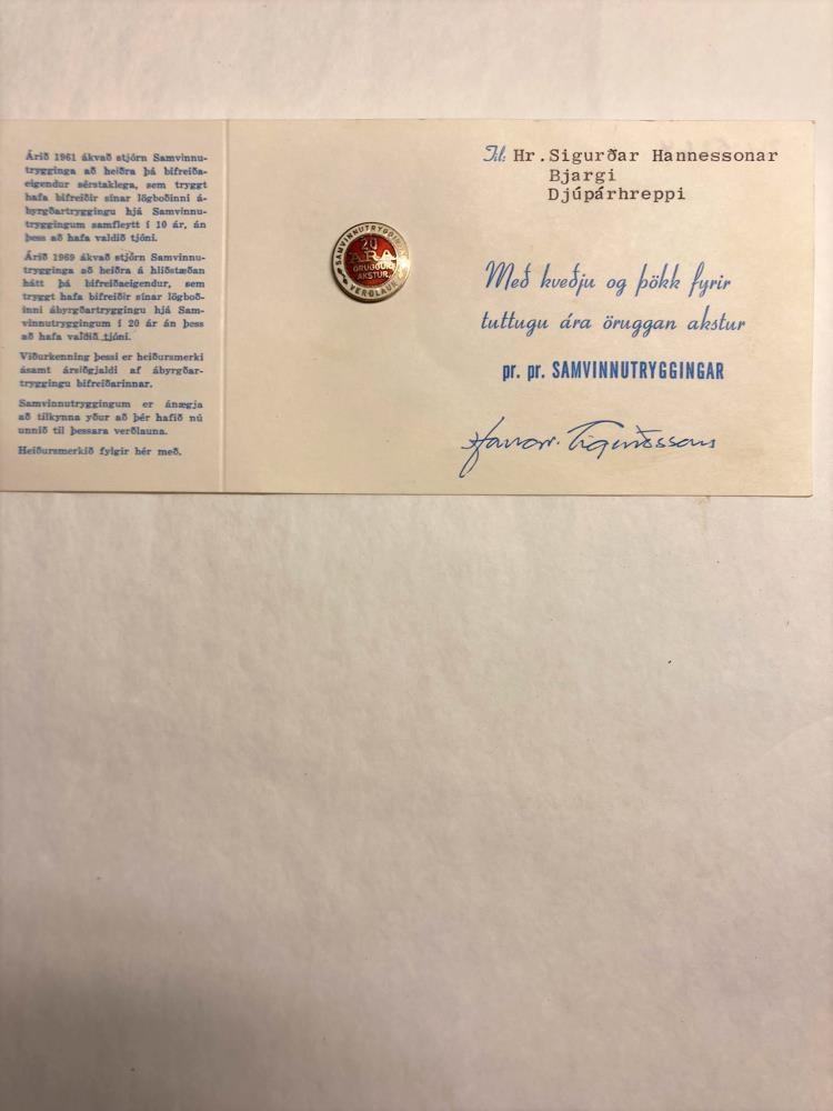 Merki frá Samvinnutryggingum til Sigurðar Hannessonar, 20 ára öruggur akstur.