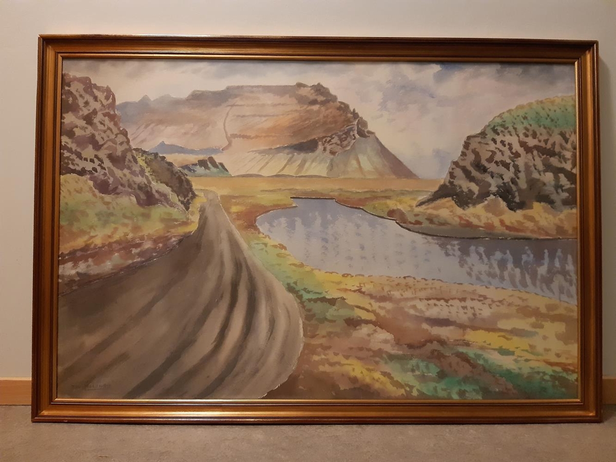 Málverk af gamla þjóðveginum í gegnum Hvamm, snýr í austurátt. Sýnir kletta og á eða vatn í forgrunni og Holtsnúpur í bakgrunni. Málað af Norðmanninum Thorvald Antonius Molander (1903-1972). Hann bjó á Íslandi 1930-1952 en fluttist svo aftur til Noregs. Myndin er í gylltum ramma.