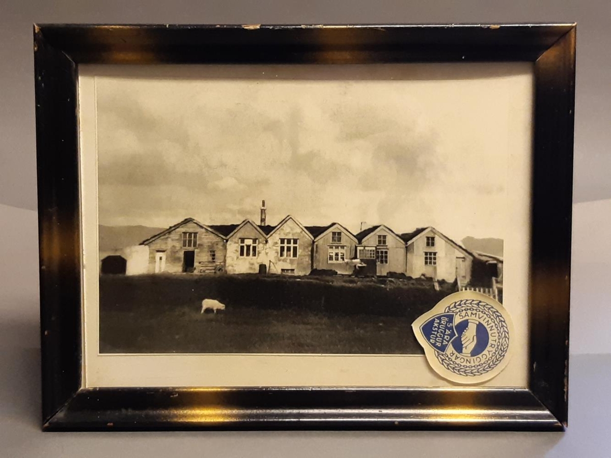 Innrömmuð svarthvít ljósmynd af bænum Lambhúshóli, sem er nú í eyði. Myndin sýnir sex bursta torfbæ. Eitt hvítt lamb er á túninu fyrir framan hann. Í rammanum er líka hvítur og blár miði í neðra hægra horni frá Samvinnutryggingum. Á honum stendur "5 ára öruggur akstur". Ramminn er svartur og gylltur.
