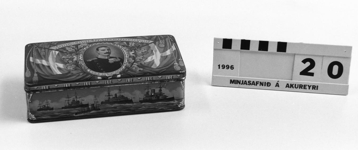 eru myndir af herskipum og skútum og lystisnekkjum konungs og á loki