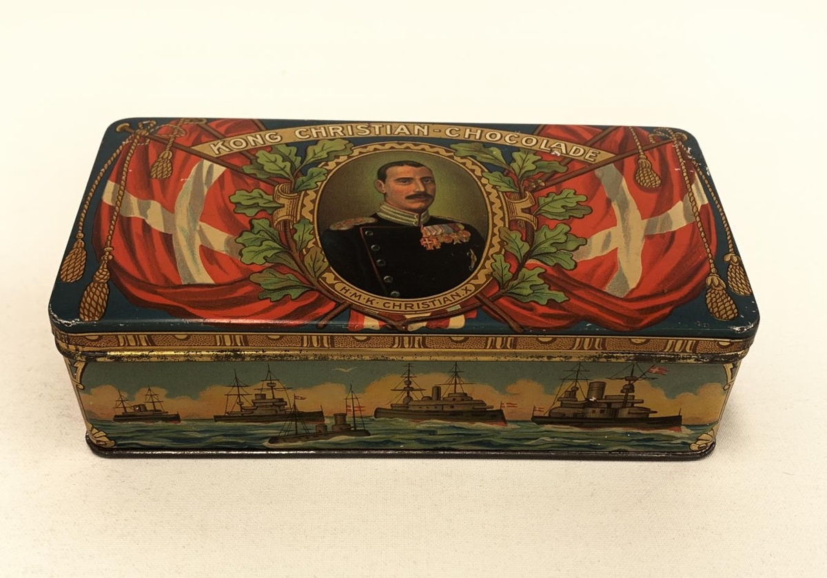 er danski fáninn og fyrir miðju er mynd af Kristjáni X Danakonungi