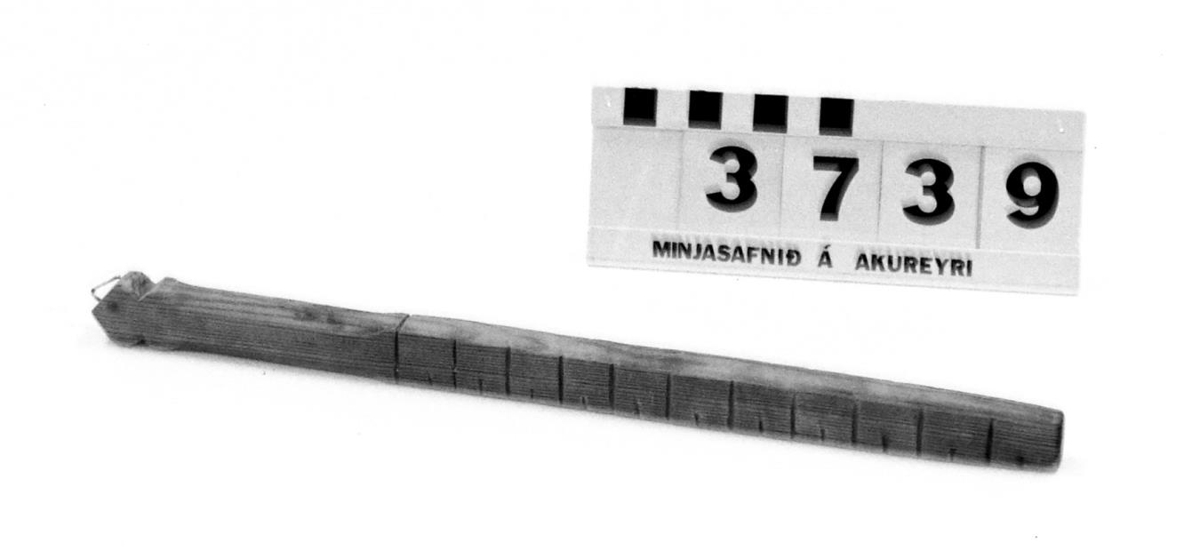 tréstöng merkt með skorum strikum þvert yfir sem tákna pott, en stutt strik