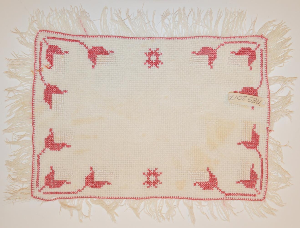 Smádúkur. Lítill dúkur sem Hólmfríður vann heima þegar hún var á barnsaldri. Hvítur með rauðu munstri. Krosssaumur í fíngerðan perlujafa. Rauð blóm með hvítum knúppum á hvítum grunni. Tunguspor (kappmelluspor) saumað utan um. Rakið er úr efninu og myndar það breitt kögur. Dúkurinn er slitinn og ber merki um mikla notkun.