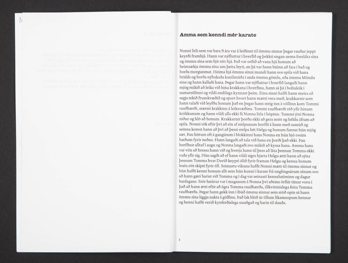 Svart prent á hvítan pappír. Heftað. Texti á íslensku.