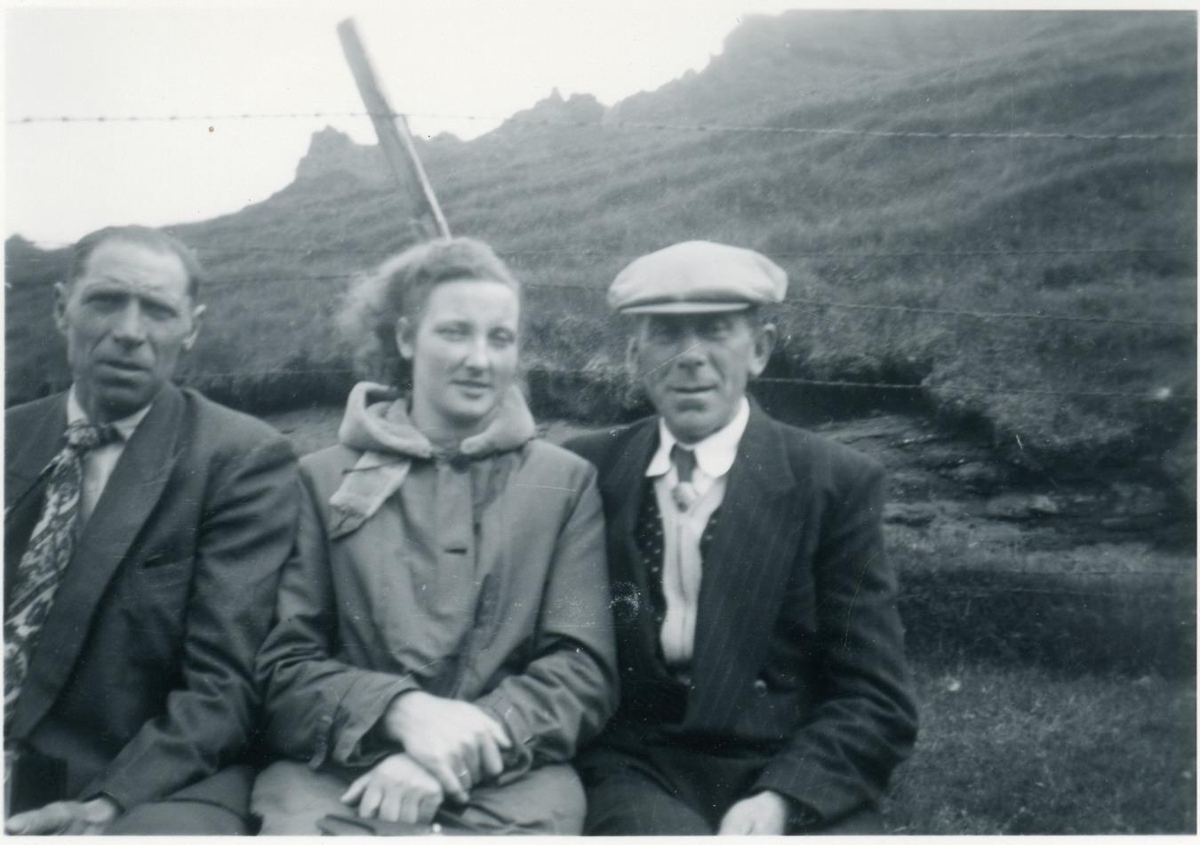 Kona situr á myndinni með karlmann sitt hvoru megin við sig. Sá sem er hægra megin er með kaskeiti á höfði. Við myndina er skrifað "Úr Árneshreppi" og miðað við lista yfir þátttakendur í ferðinni eru þetta, frá vinstri, Þorsteinn Guðmundsson og Pálína Þórólfsdóttir frá Finnbogastöðum ásamt Guðmundi Guðmundssyni frá Melum.