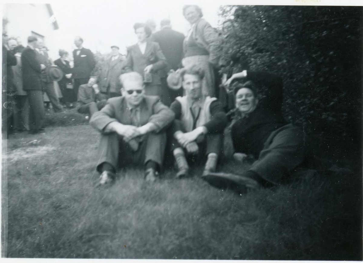 Þrír menn sitja saman í grasi, með trjárunna til hægri. Maðurinn til hægri hálf liggur í grasinu með aðra hendi yfir höfði. Við myndina er skrifað "Bílstjórar - Heiðar, Pétur og Jón frá Múla".