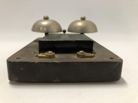 Símabjalla . Dökk viðarplata, lokuð að aftan með viðarspjaldi. Svartur málmkassi að framan og upp úr honum festingar fyrir tvær málmbjöllur og lítinn "kólf" á milli þeirra. Bjalla þessi er af síma sem var á Kiðjabergi til 1970.