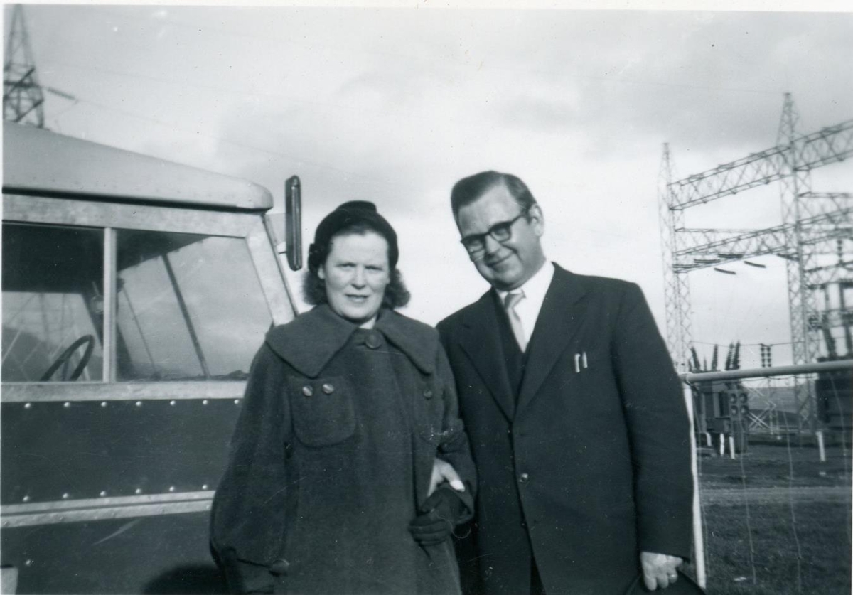 Maður og kona standa hlið við hlið. Vinstra megin sést í bifreið en hægra megin í tengivirki fyrir rafmagn. Konan er í dökkri kápu með höfuðfat, maðurinn er með gleraugu, ljóst binid og í dökkum jakkafötum. Við myndina er skrifað "Ingólfur Ástmarsson og Rósa".