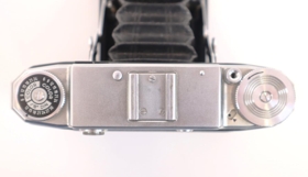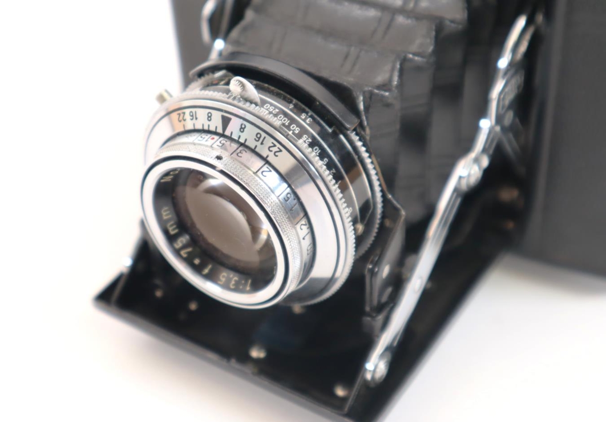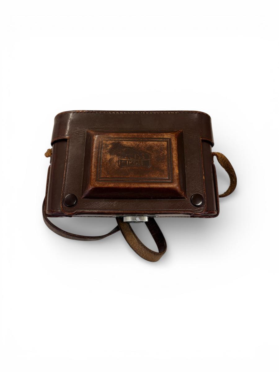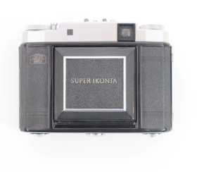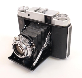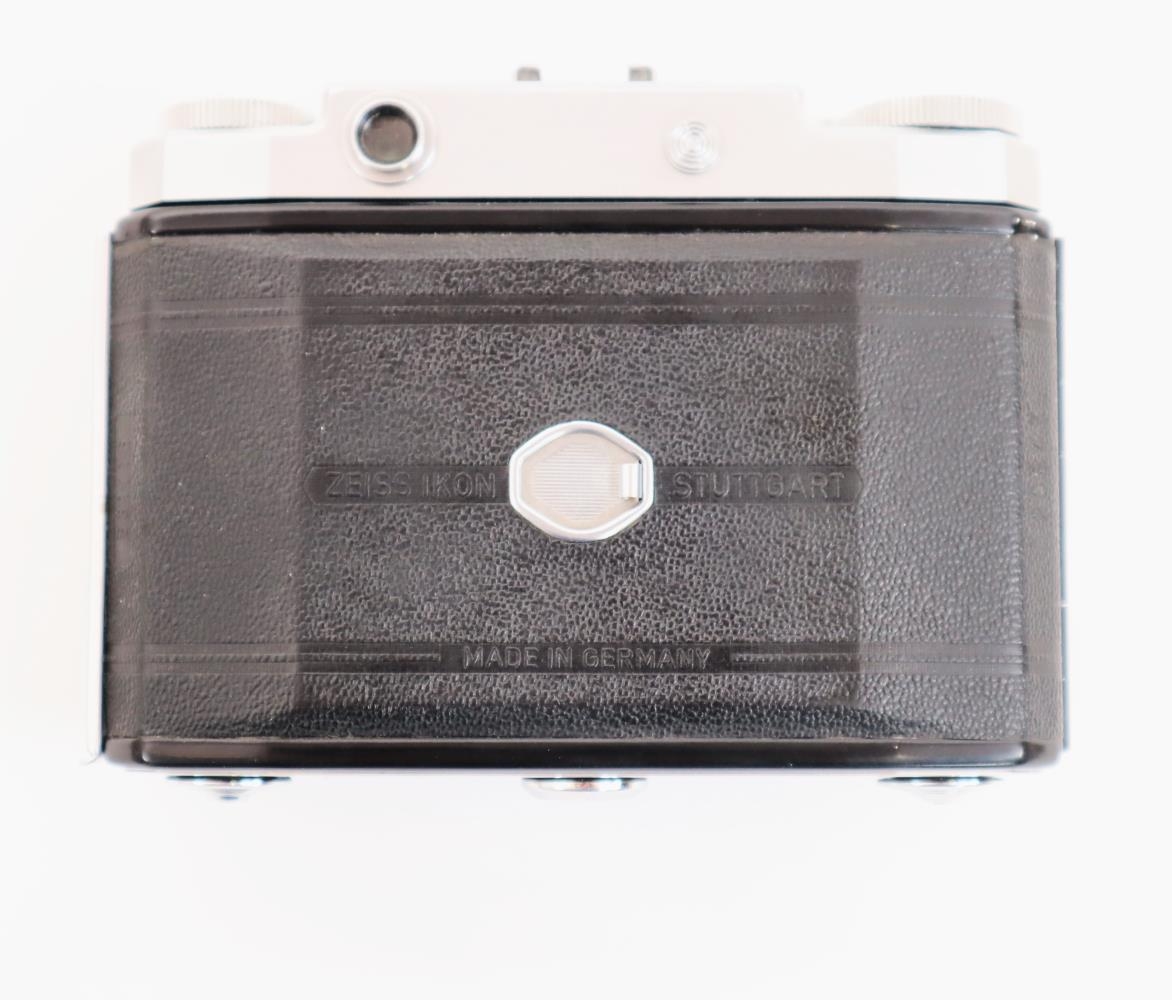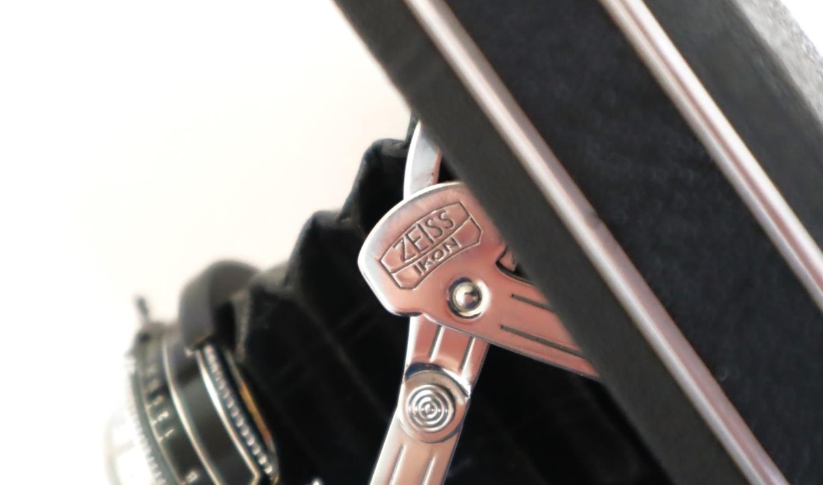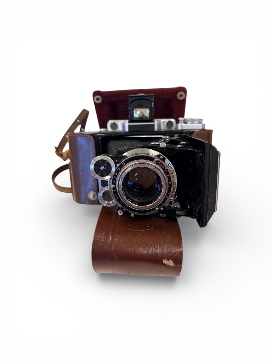 Ljósmyndavél af gerðinni "Zeiss Ikon". Linsa er dregin út; á "harmoniku" belg. Vélin er svört og ljósgrá (járn) og nokkuð hefðbundin að stærð og útliti. Henni fylgir brún leðurtaska.
