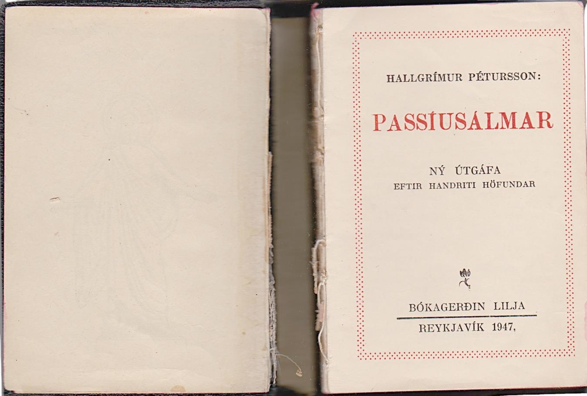 Passíusálmar Hallgríms Péturssonar (1614-1674). Útgefið Lilja árið 1947 í Reykjavík. Á titilblaði stendur að sé ný útgáfa en rétt er að sé 60. prentun. 216 bls. Þarfnast lagfæringar. Svört að lit.