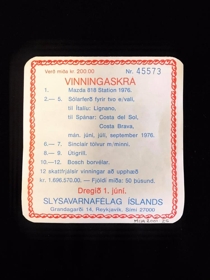 Happdrættismiði Slysavarnafélag Íslands árið 1976. Miðinn er í tvíbroti, merki félagsins framan á miðanum. Innan í bæklingnum er auglýsing frá Flugfélagi Íslands, Loftleiðir. Á bakhlið eru miðanúmer, Vinningaskrá og upplýsingar. Helstu vinningar eru bíll, sólarferðir, tölvur, útigrill og borvélar.
