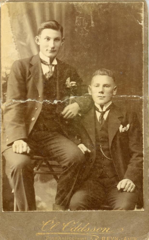 Tveir ungir menn sitja fyrir á mynd, báðir klæddir fínum jakkafötum með bindi og vasaklút í brjóstvasa. Sá vinstra megin, Skeggi Samúelsson, situr hærra en sá hægra megin, Benedikt Grímsson á Kirkjubóli.